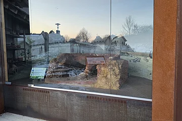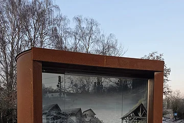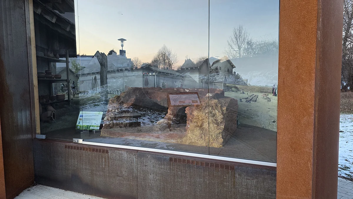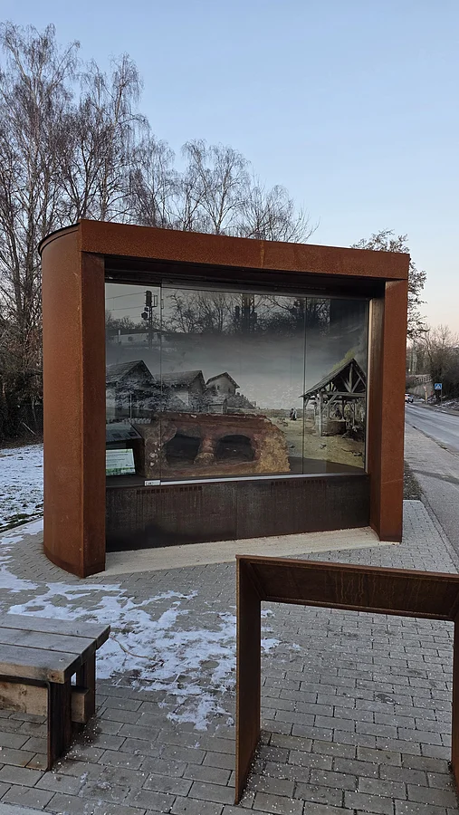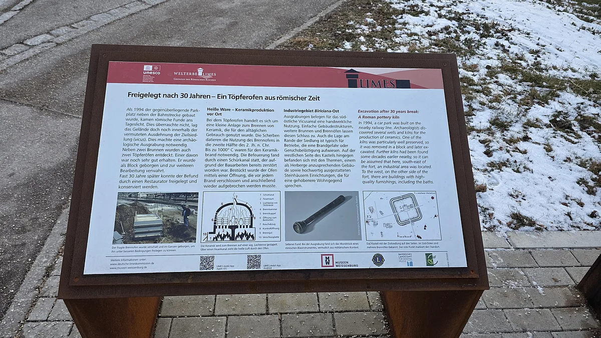 Als 1994 der gegenüberliegende Parkplatz neben der Bahnstrecke gebaut wurde, kamen römische Funde ans Tageslicht. Dies überraschte nicht, lag das Gelände doch noch innerhalb der vermuteten Ausdehnung der Zivilsiedlung (vicus). Dies machte eine archäologische Ausgrabung notwendig. Neben zwei Brunnen wurden auch zwei Töpferöfen entdeckt. Einer davon war och sehr gut erhalten. Er wurde als Block geborgen und zur weiteren Bearbeitung verwahrt. Fast 30 Jahre später konnte der Befund durch einen Restaurator freigelegt und konserviert werden. Die jetzige Präsentation konnte unter anderem mit Mitteln aus dem europäischen LEADER-Programm und Spenden vom Lions-Club realisiert werden.