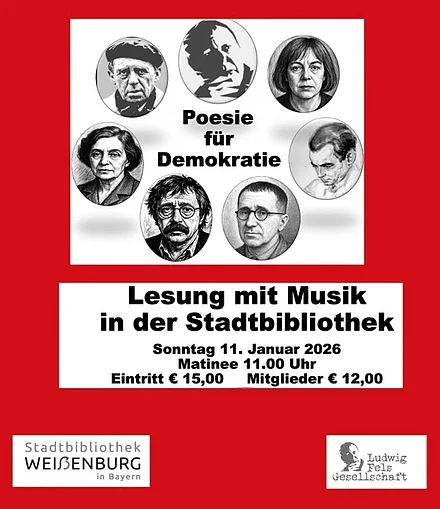 Unter dem Motto "Poesie für Demokratie" werden Texte von Fels, Böll, Kästner und weiteren durch Irnela Körner und Gerd Schulze vorgetragen. Diese Texte begleitet musikalisch das Weissenburger…