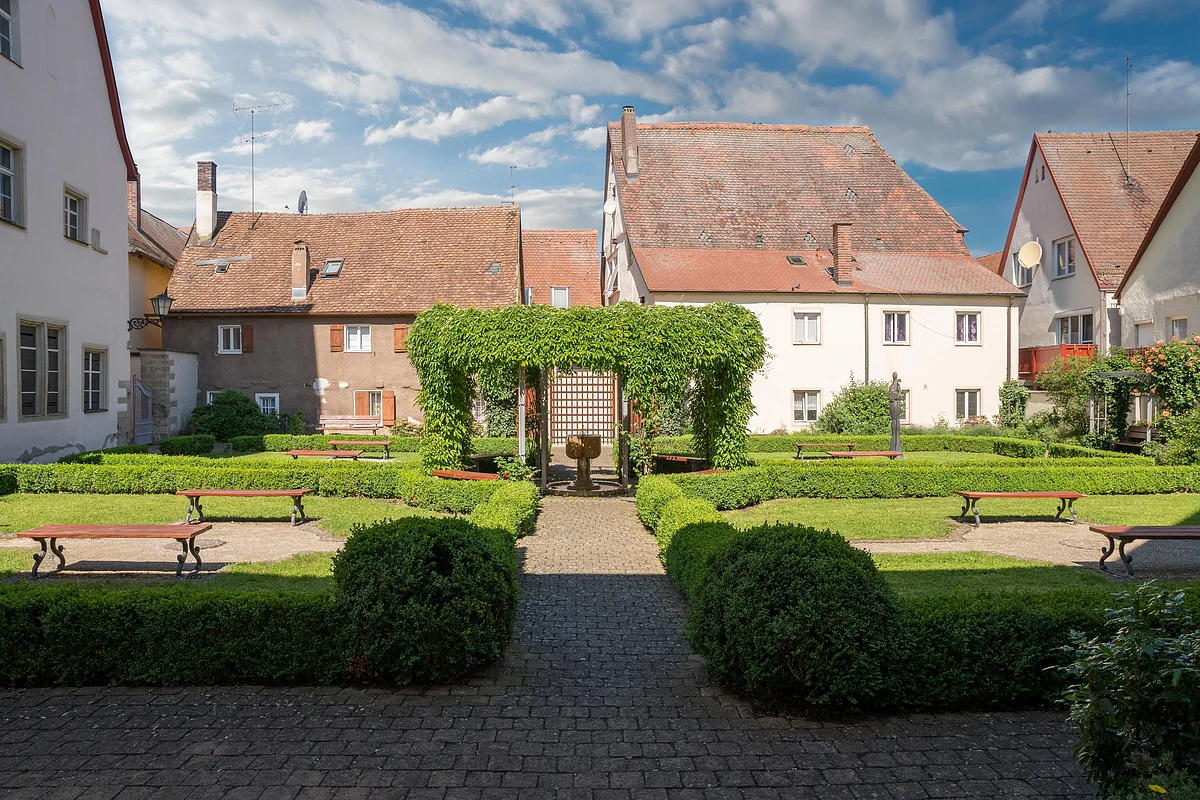Innenhof mit gepflegtem Garten, Bänken, Hecken und alten Häusern mit roten Ziegeldächern im Hintergrund.