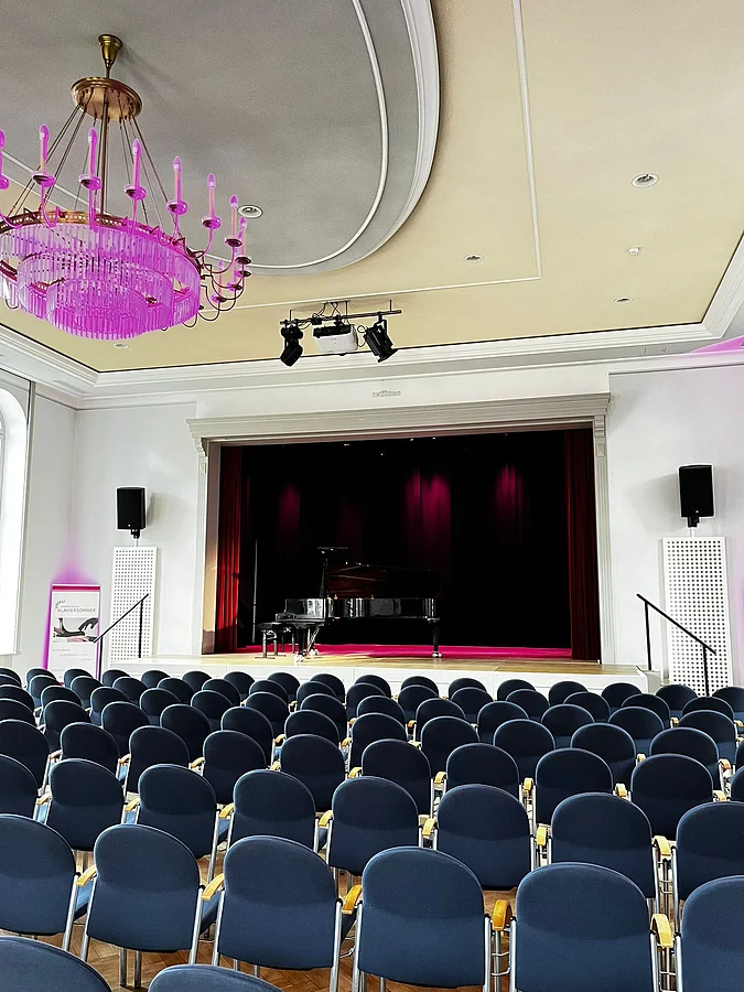 Wildbadsaal WeißenburgDie dunkelblauen Stühle sind in Kinobestuhlung mit Blick zur Bühne gerichtet.WildbadsaalWildbadsaal