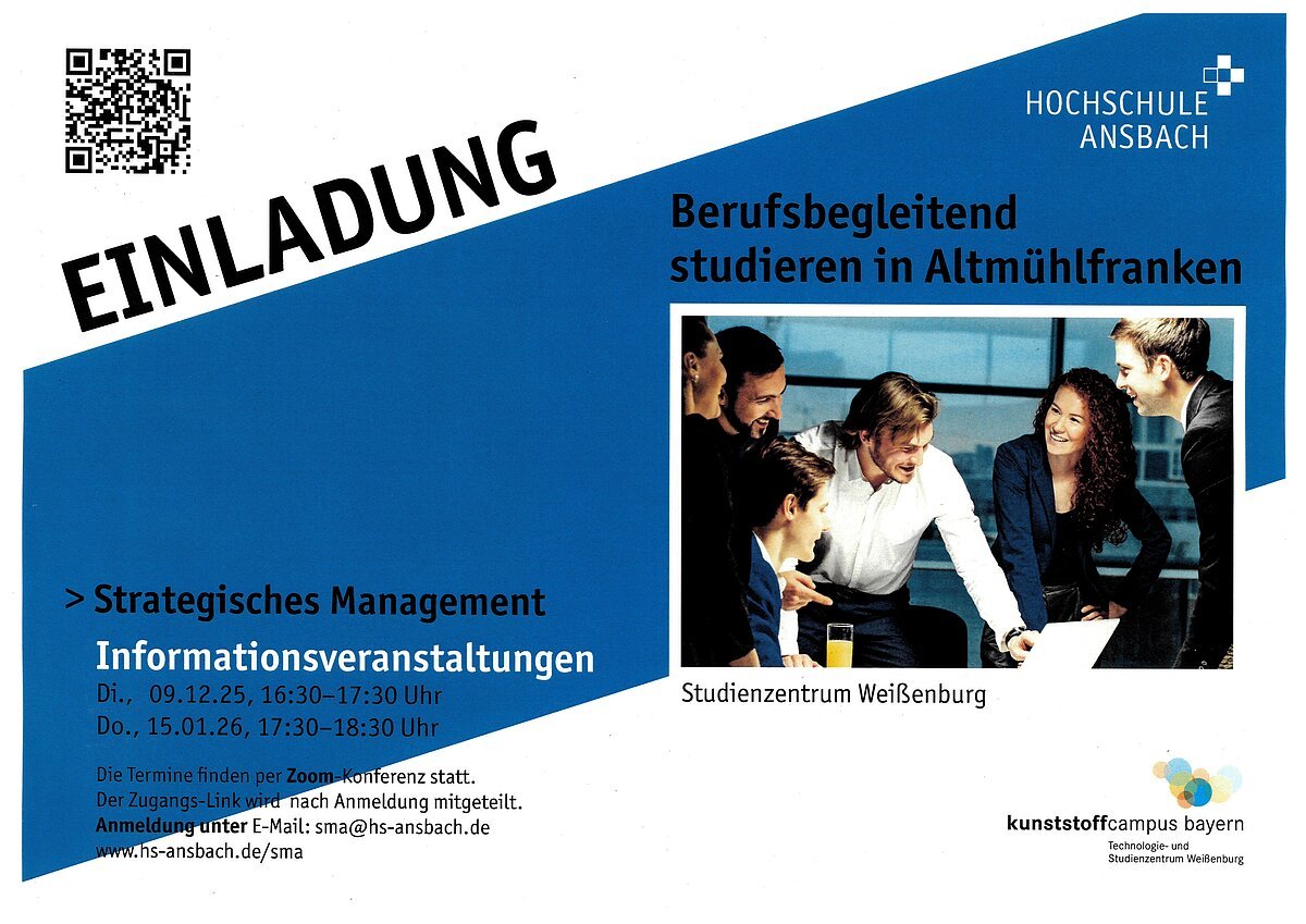 Berufliche Bildung – stehen bleiben oder weitergehen? Der kunststoffcampus bayern in Weißenburg lädt zur Informationsveranstaltung "Strategisches Management", Berufsbegleitend studieren in Altmühlfranken an nachfolgenden Terminen ein: