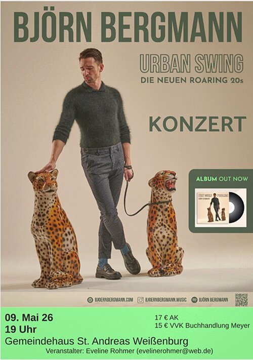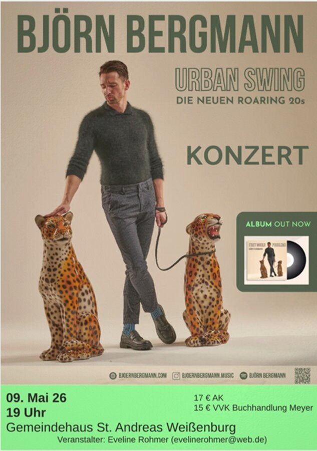 BJÖRN BERGMANN - DIE NEUEN ROARING 20s Ballroom, Nostalgie und Sinatra treffen auf das Nachtleben eines schwulen Clubgängers: Gibt es Romantik noch in der Großstadt von heute? Was bleibt am Morgen nach dem Berghain? Berliner Partyboy Björn Bergmann feiert mit neuen Songs sein Revival der Roaring 20s: Weit weg von Krawatten und Palastorchestern. Sein Sound: „Urban Swing“ der aktuellen 20er Jahre. Mit einer gesunden kulturellen Aneignung nimmt der studierte Jazzsänger etwas Altes und macht daraus frech etwas völlig Neues. Im Frühjahr 2026 erscheint sein Album “First World Problems”. Ob bei Radio Eins (rbb), den Arosa Jazztagen, im Deutschen Theater München oder im Frannz Club Berlin - seine Stimme trägt, die Band brennt, sein Humor wirkt der Schwerkraft entgegen. Wer bisher mit Swing nichts am Hut hatte, könnte nach einem Abend mit Björn Bergmann ganz anderer Meinung sein.