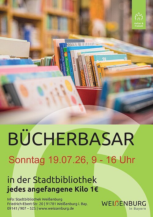 Zum Weißenburger Altstadtfest findet wieder der Bücherbasar der Weißenburger Stadtbibliothek Weißenburg statt. Von 9 bis 16 Uhr kann sich jeder mit Büchern, Spielen, DVDs und Hörbüchern eindecken und dabei sparen.