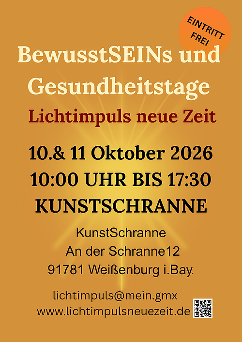 Die Bewusstseins- und Heilmesse lädt dazu ein, Körper, Geist und Seele in Einklang zu bringen. Aussteller und Experten aus den Bereichen ganzheitliche Gesundheit, Spiritualität und energetische Heilmethoden bieten Inspiration, Beratung und neue Impulse für ein bewusstes Leben. Erlebe Vorträge, Workshops und Produkte, die dich auf deinem persönlichen Weg unterstützen.
