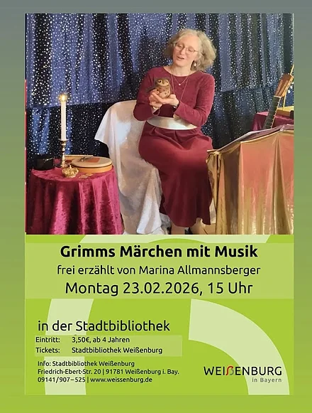 Grimms Märchen mit Musik. Marina Allmannsberger erzählt frei und auswendig Grimms Märchen. Dabei unterstützt sie die Geschichten mit Instrumenten und Gesang. Montag 25.2., Stadtbibliothek. Die…
